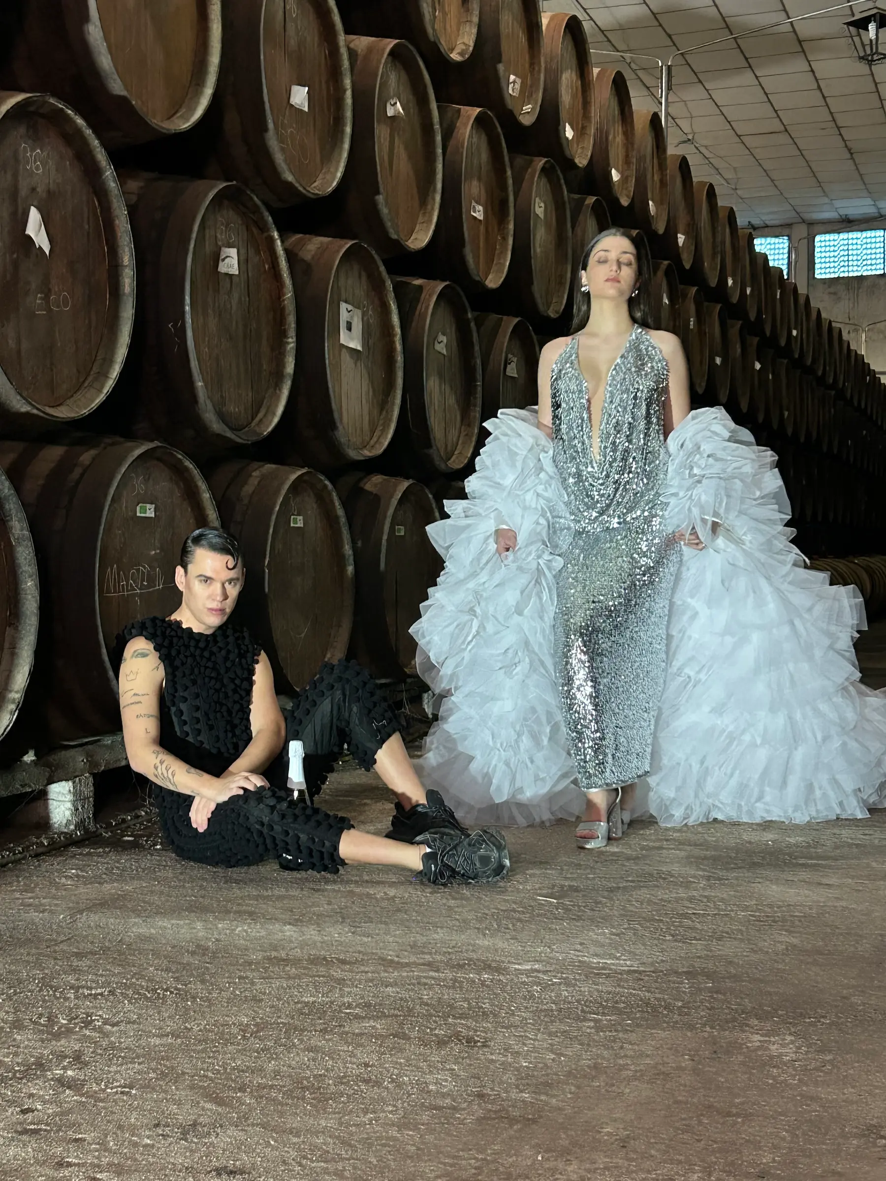 Ambas piezas se elaboraron en directo, convirtiendo la costura en un gesto vivo que dialoga con la crianza del vino. La aguja, el hilo y el tejido reproducen así valores compartidos: precisión, paciencia, respeto al proceso y verdad del origen.